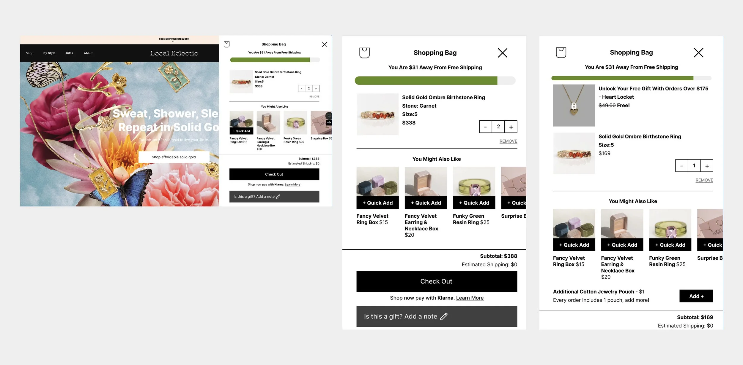 Goal: Create a seamless and intuitive experience for users to manage their cart items while ensuring minimal disruption to their shopping flow. Including the additions of cart upsells and seasonal gift with purchase promotions.
